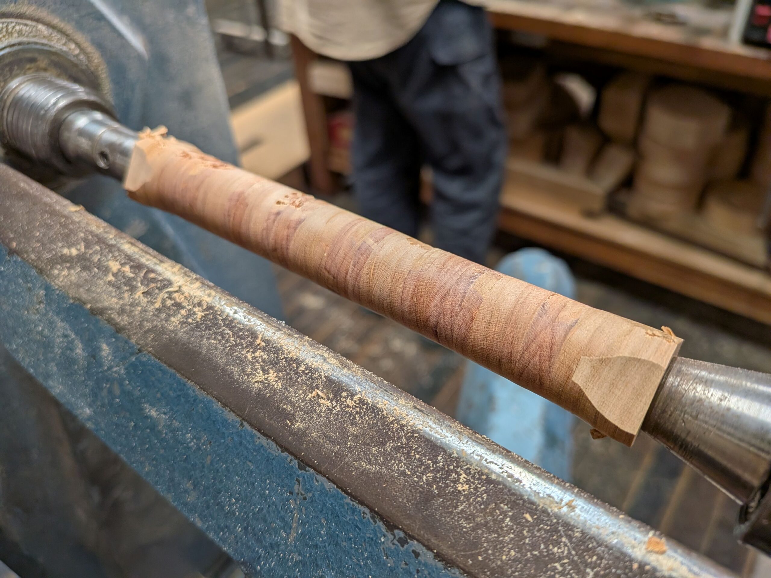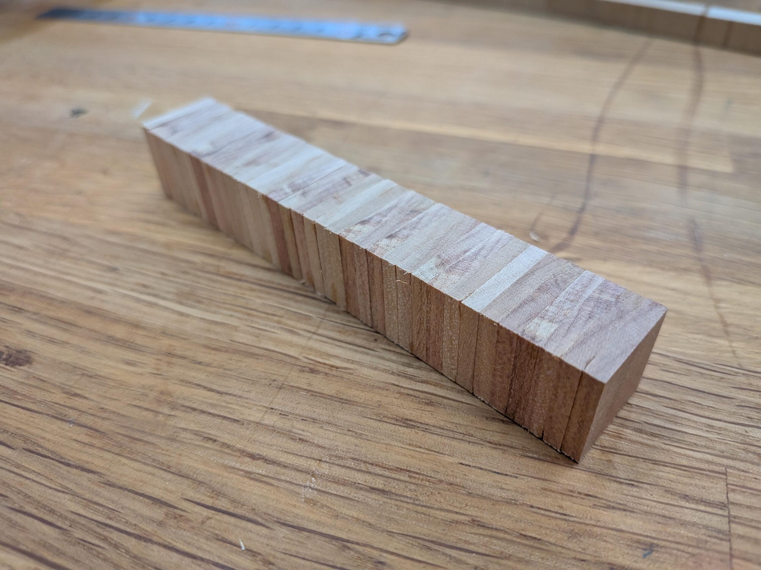 特に丸いパーツ!薄めの丸いパーツをたくさん作るのは丸棒を輪切りにする、という訳にはいきません。薄いパーツなので輪切りだと木口方向ですぐに割れてしまうからです。先生に相談し、一旦小さな板状の四角いパーツを作る→角の2点のみ仮接着して角材状にしていく→旋盤で丸棒状に削っておおよそ完成…という工程で製作しましたが、一度に沢山作ることはできないため、少し心が折れそうでした。一見単純な形状に見えても、出来上がるまでには多くの工程があります。