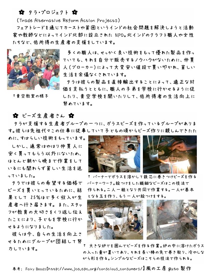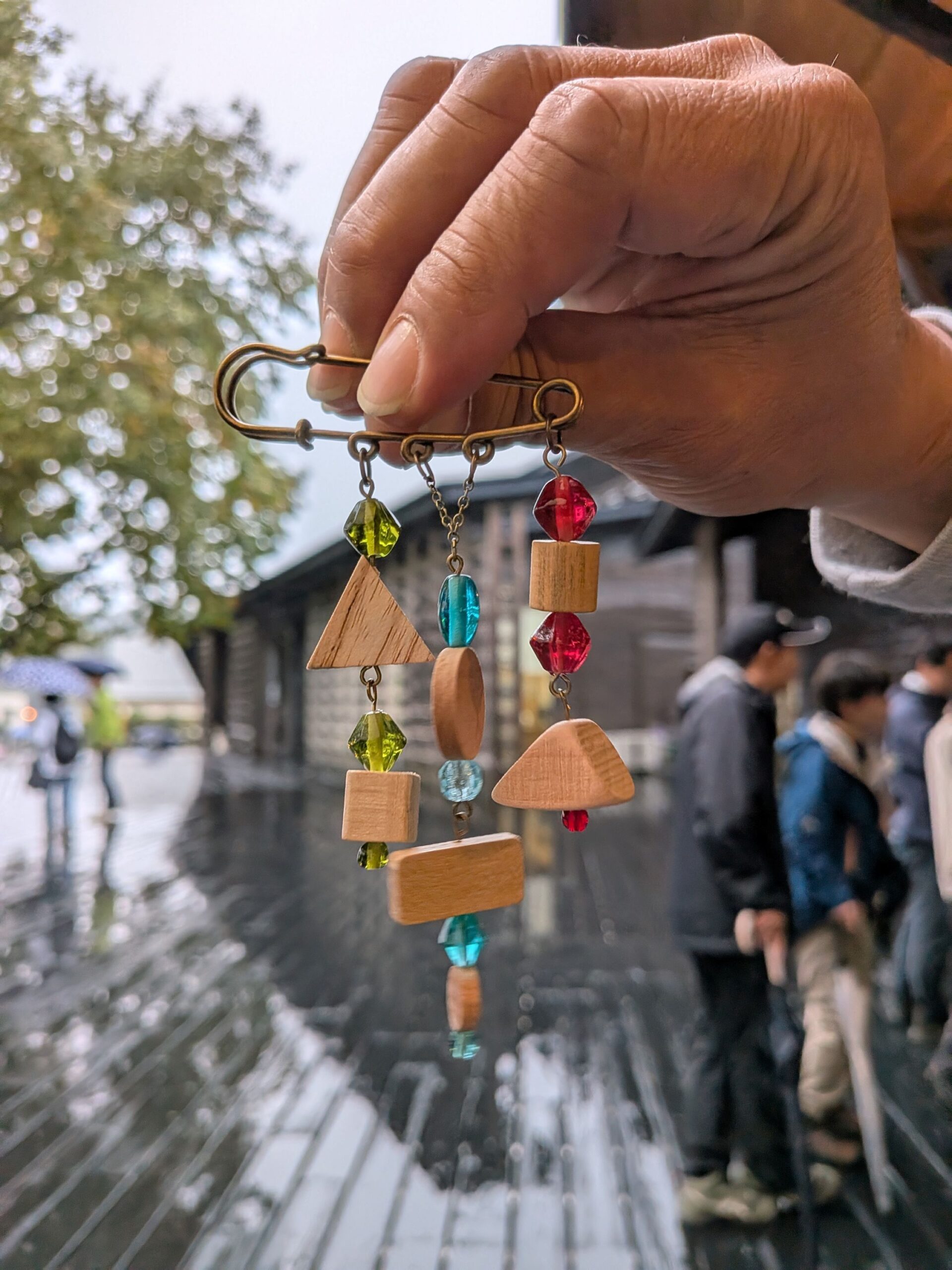 本筋とは逸れるかもしれませんが、友人でもある名古屋のフェアトレードショップ【顔の見える店 風”s】さんにお願いし、インドの職人さんが手仕事で作られたガラスビーズも用意しました。木のパーツとの相性も良く、参加いただいた方にも好評だったように思います。これを用意したのは「誰が、どこで、どうやって ものがつくられているのか、それをどうやって伝えていくのか」という事を私自身がものづくりに携わる上でのテーマ的にしたいと思ってのことです。