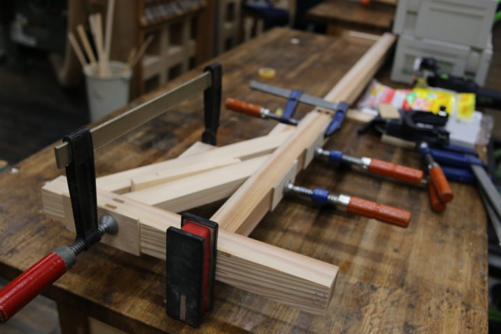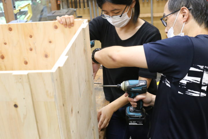 モックアップで修正点などを確認し、実際に製作を進めていきます。衝立チームは角度のついた部材もあり、難しい組み立てになりました。