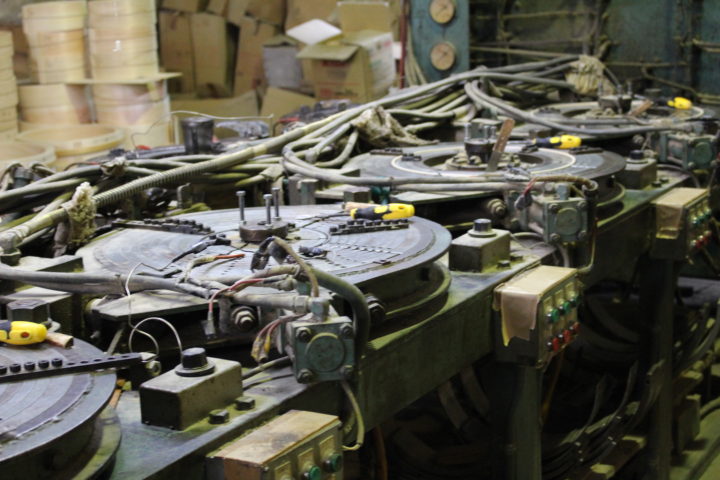 量産の曲げわっぱを製造するには様々な機械を使用するそうで、曲げ物の種類によってローラーを変えて曲げ癖をつける機械や、日本では1台か2台あるかないかの曲げ物を接ぐための専用機が用いられて、電動ヒーターで強制的に乾かして作業のスピードを上げています。