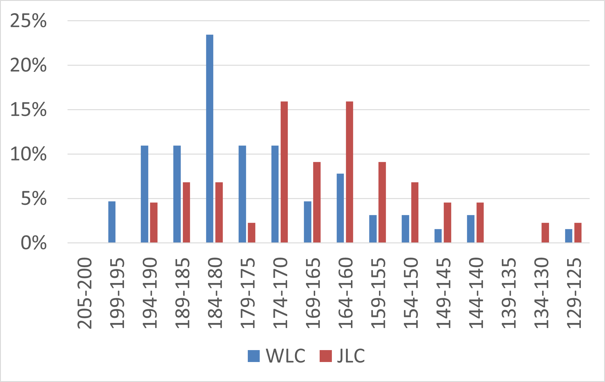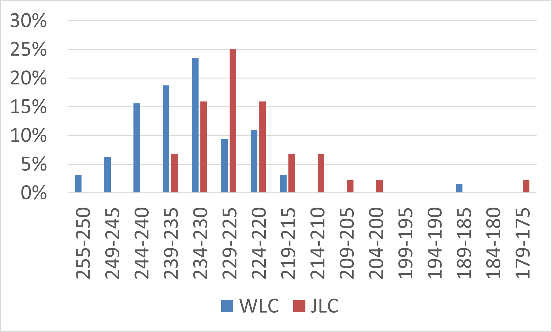 同じく樹種はドイツトウヒで、結果は233点です。240点以上を目標にしていたため、少し悔いが残る結果です。また今回のWLCと過去3大会のJLCの得点分布をグラフにしてみました。WLCの中央値は233点です。WLCでは10点分JLCより全体の得点が高い傾向です。やはり柔らかいドイツトウヒを使用しているというのが要因かもしれません。