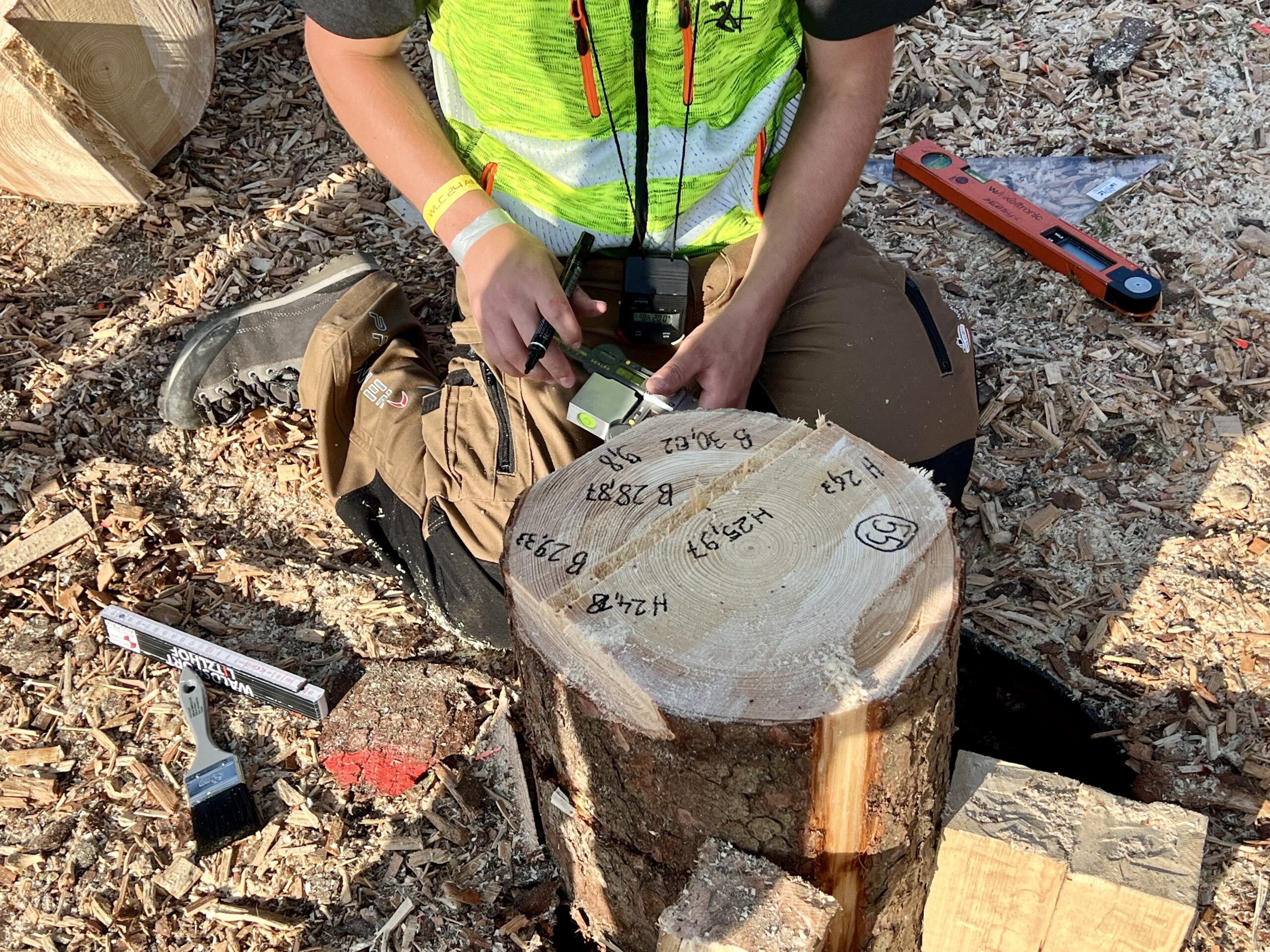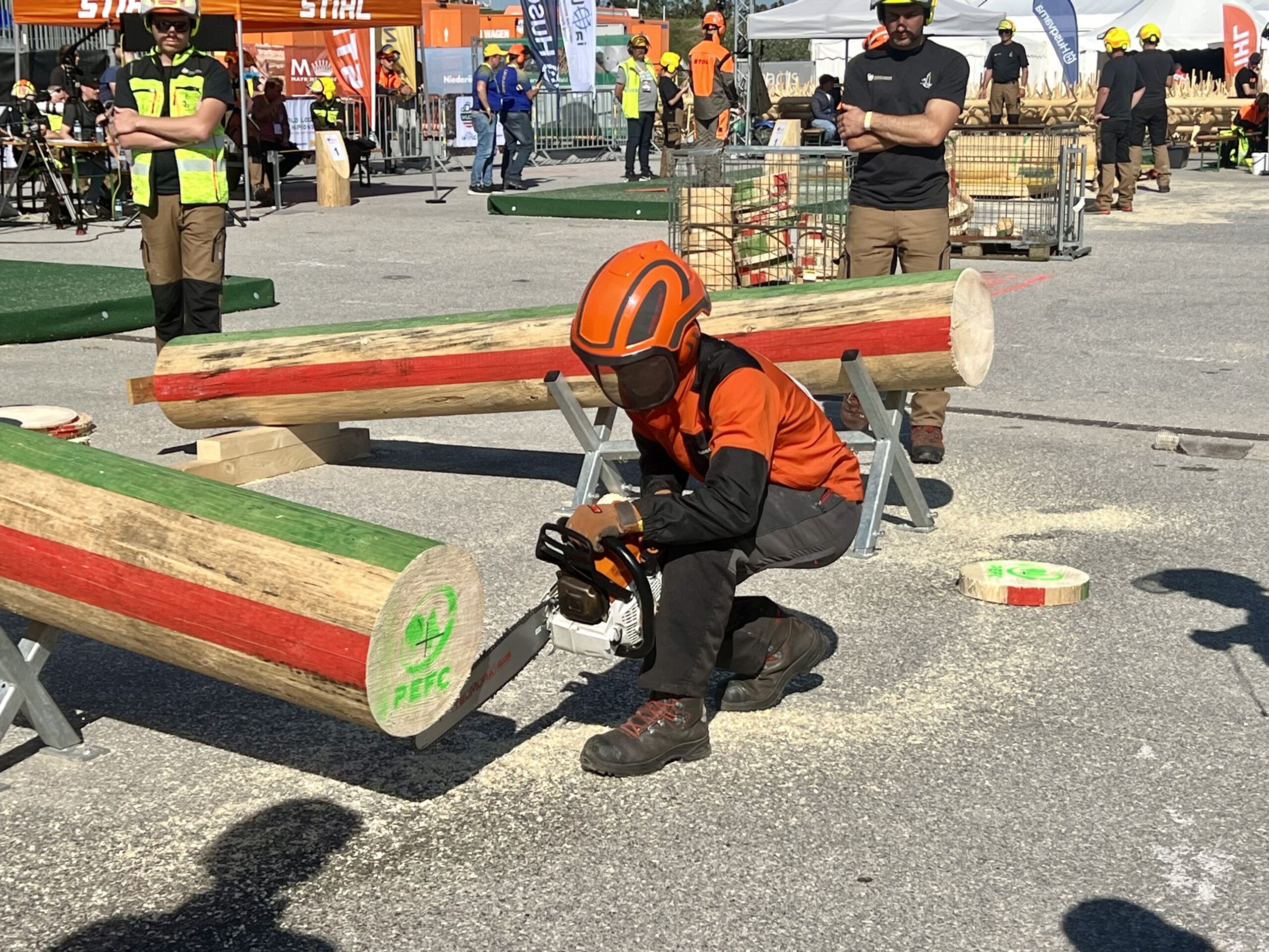 15mのマストツリーで樹種はドイツトウヒです。伐倒後に跳ねることがないよう、砂が引かれています。結果は、15cmずれでツルの幅高の減点はなしで、645点でした。このチェンソーを使うのが海外発送の関係で約1か月ぶりであり、水平間隔、ガンマークの見方を確かめるのに、多少の調整が必要でした。切った感じは多少ヒノキのような固い樹種のように思いましたが、いつも通りプレー出来ました。他の日本人選手も、いつもと変わりなく競技が出来たようです。