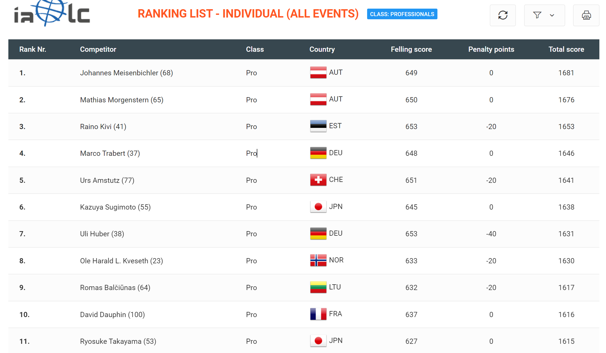 11位までの選手の過去の戦歴です。ialcのHPに掲載されている大会以降の戦績ですので、もっと出場回数が多い選手がいるかもしれません。9位リトアニアのRomas Balčiūnas選手(9回出場)、4位ドイツのMarco Trabert選手(8回出場)、8位ノルウェーのOle Harald L. Kveseth選手(8回出場)、10位フランスのDavid Dauphin選手(7回出場)、5位スイスのUrs Amstutz選手(6回出場)など、ものすごいレジェンドたちが名を重ねています。若さだけではなく、「経験がものをいう」のは、実際の林業そのものに近いのかもしれません。