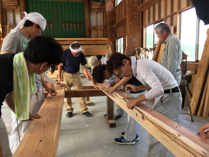 基礎工事がひと段落した段階で、大工修行に県内の工務店に合宿。墨付け刻みは手加工で行うのが基本。