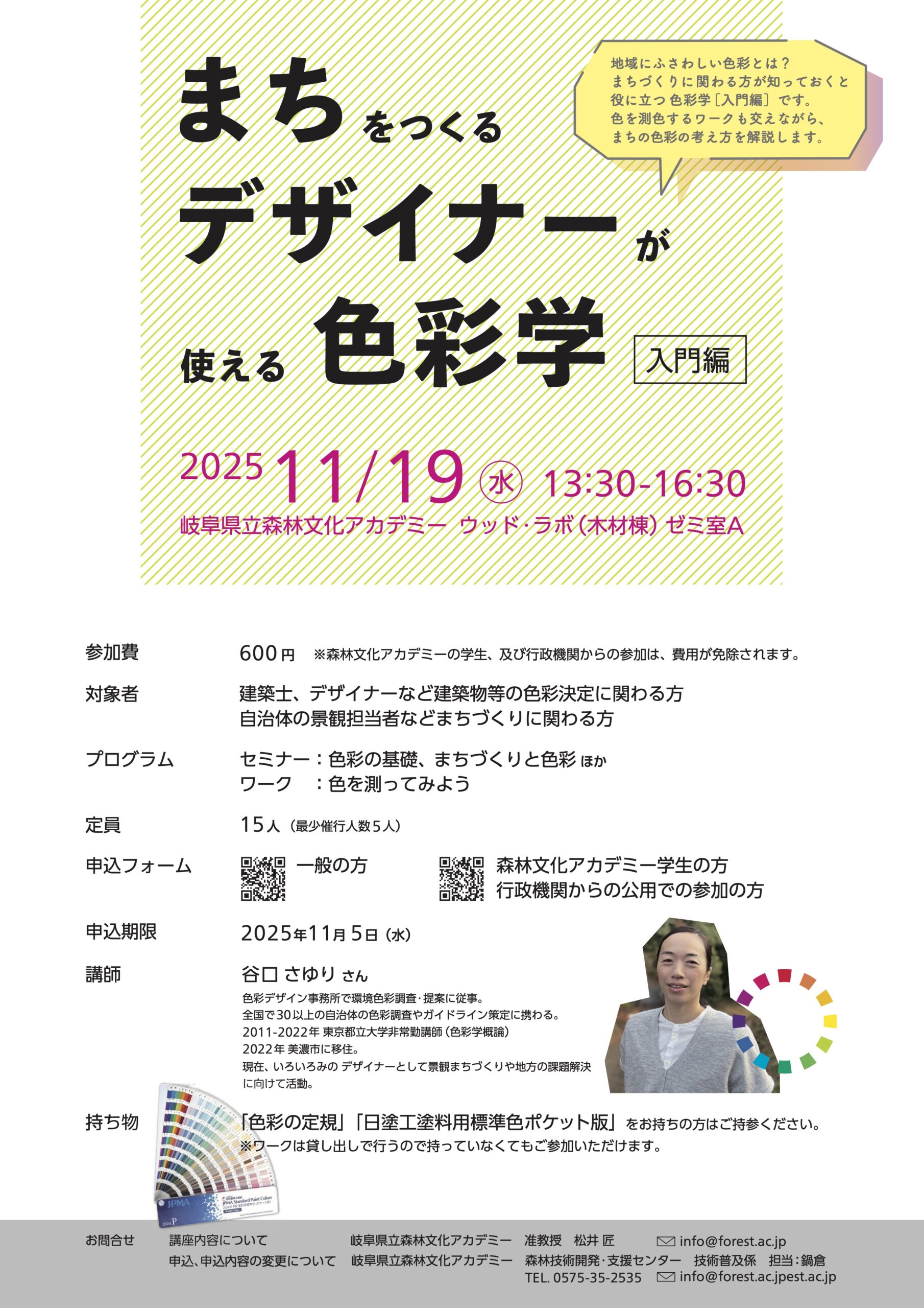 対象者:建築士、デザイナーなど建築物等の色彩決定に関わる方、自治体の景観担当者などまちづくりに関わる方 |